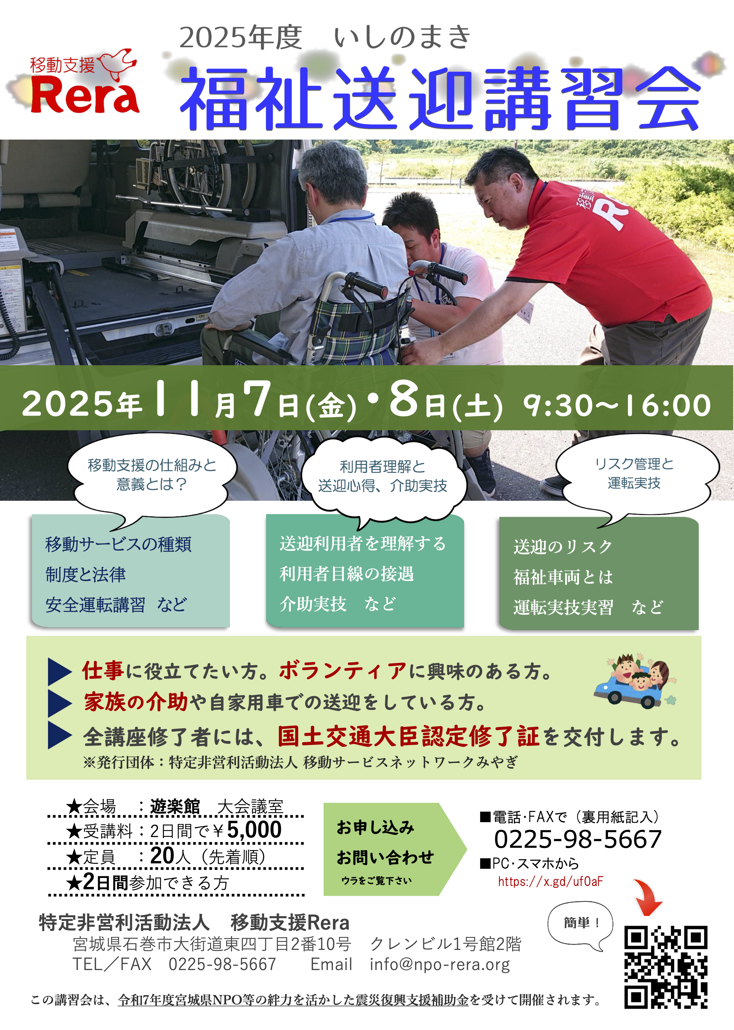 石巻市遊楽館にて、2025年11月7日(金)8日(土)と2日間にわたる福祉送迎講習会を開催します!!